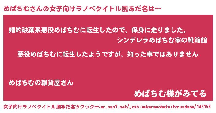 | 男性向けラノベタイトル風あだ名 | 『この素晴らしい世界にめばちむを!』 |