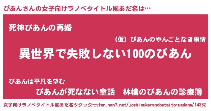| 男性向けラノベタイトル風あだ名 | 『びあんという概念が存在しない退屈な世界 』 |