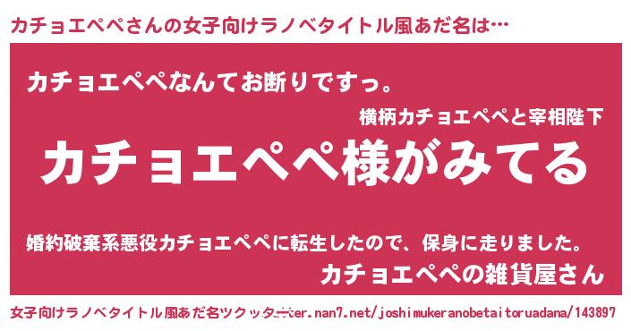 カチョエぺぺさんの女子向けラノベタイトル風あだ名は… 『カチョエぺぺ様がみてる』『カチョエぺぺなんてお断りですっ。』『カチョエぺぺの雑貨屋さん』 ツクッター #女子向けラノベタイトル風あだ名ツクッター http://tkutter.nan7.net/joshimukeranobetaitoruadana/143897/