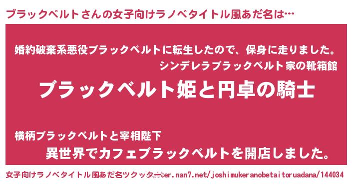 ブラックベルトさんの女子向けラノベタイトル風あだ名は… 『ブラックベルト姫と円卓の騎士』『婚約破棄系悪役ブラックベルトに転生したので、保身に走りました。』『異世界でカフェブラックベルトを開店しました。』 ツクッター #女子向けラノベタイトル風あだ名ツクッター http://tkutter.nan7.net/joshimukeranobetaitoruadana/144034/