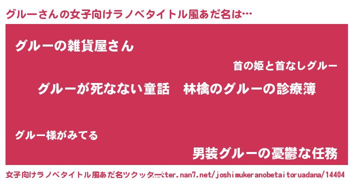 | 男性向けラノベタイトル風あだ名 | 『魔弾の王とグルー』 |