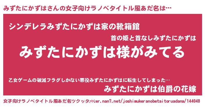 | 男性向けラノベタイトル風あだ名 | 『みずたにかずはの嫁は女の子じゃないと思った?』 |
