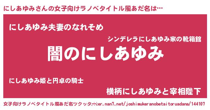 | 男性向けラノベタイトル風あだ名 | 『Re:にしあゆみから始める異世界生活』 |