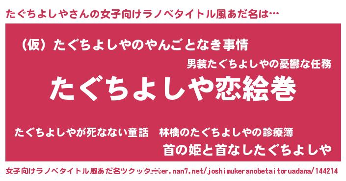 | 男性向けラノベタイトル風あだ名 | 『おまえをオタクにしてやるから、俺をたぐちよしやにしてくれ! 』 |