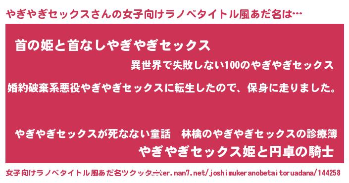 | 男性向けラノベタイトル風あだ名 | 『ヤギヤギセックススレイヤー』 |