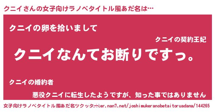 クニイさんの女子向けラノベタイトル風あだ名は… 『クニイなんてお断りですっ。』『クニイの卵を拾いまして』『悪役クニイに転生したようですが、知った事ではありません』 ツクッター #女子向けラノベタイトル風あだ名ツクッター http://tkutter.nan7.net/joshimukeranobetaitoruadana/144265/