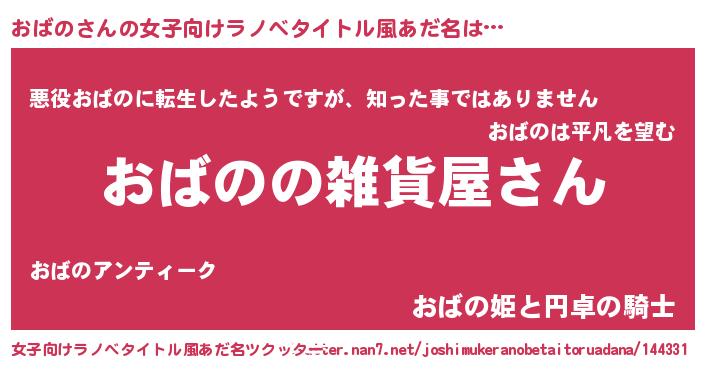 おばのさんの女子向けラノベタイトル風あだ名は… 『おばのの雑貨屋さん』『悪役おばのに転生したようですが、知った事ではありません』『おばの姫と円卓の騎士』 ツクッター #女子向けラノベタイトル風あだ名ツクッター http://tkutter.nan7.net/joshimukeranobetaitoruadana/144331/