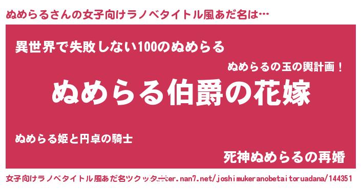 | 男性向けラノベタイトル風あだ名 | 『やはりぬめらるの青春ラブコメはまちがっている 』 |