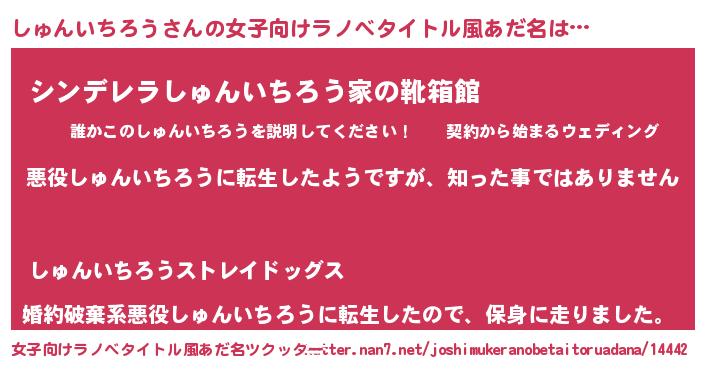 しゅんいちろうさんの女子向けラノベタイトル風あだ名は… 『悪役しゅんいちろうに転生したようですが、知った事ではありません』『シンデレラしゅんいちろう家の靴箱館』『婚約破棄系悪役しゅんいちろうに転生したので、保身に走りました。』 ツクッター #女子向けラノベタイトル風あだ名ツクッター http://tkutter.nan7.net/joshimukeranobetaitoruadana/14442/