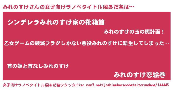 | 男性向けラノベタイトル風あだ名 | 『この素晴らしい世界にみれのすけを!』 |