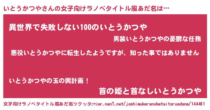 | 男性向けラノベタイトル風あだ名 | 『この素晴らしい世界にいとうかつやを!』 |