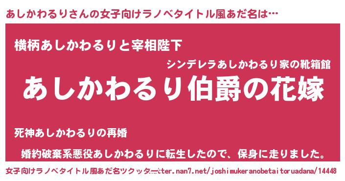 | 男性向けラノベタイトル風あだ名 | 『やはりあしかわるりの青春ラブコメはまちがっている 』 |