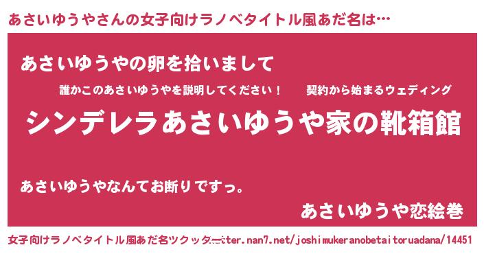 | 男性向けラノベタイトル風あだ名 | 『冴えないあさいゆうやの育てかた』 |