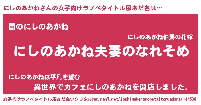 | 男性向けラノベタイトル風あだ名 | 『おまえをオタクにしてやるから、俺をにしのあかねにしてくれ! 』 |