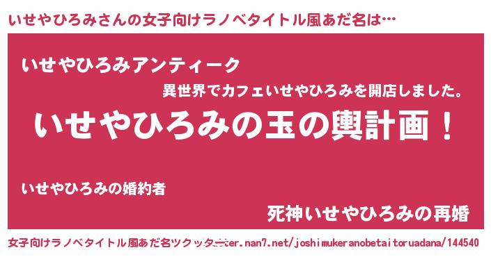 いせやひろみさんの女子向けラノベタイトル風あだ名は… 『いせやひろみの玉の輿計画!』『いせやひろみアンティーク』『死神いせやひろみの再婚』 ツクッター #女子向けラノベタイトル風あだ名ツクッター http://tkutter.nan7.net/joshimukeranobetaitoruadana/144540/