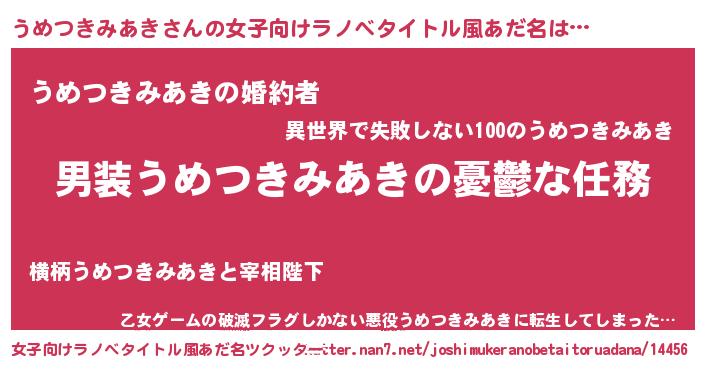 | 男性向けラノベタイトル風あだ名 | 『うちのうめつきみあきが世界を掌握している!』 |