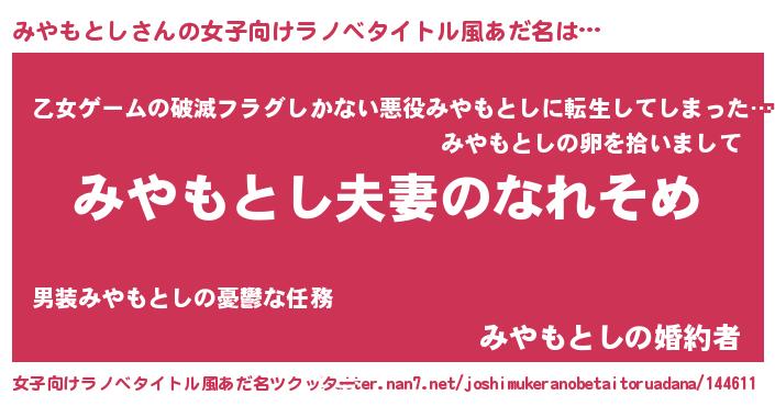 | 男性向けラノベタイトル風あだ名 | 『おまえをオタクにしてやるから、俺をみやもとしにしてくれ! 』 |