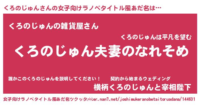| 男性向けラノベタイトル風あだ名 | 『おまえをオタクにしてやるから、俺をくろのじゅんにしてくれ! 』 |