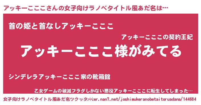 | 男性向けラノベタイトル風あだ名 | 『アッキーこここの嫁は女の子じゃないと思った?』 |