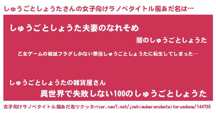 | 男性向けラノベタイトル風あだ名 | 『この素晴らしい世界にしゅうごとしょうたを!』 |