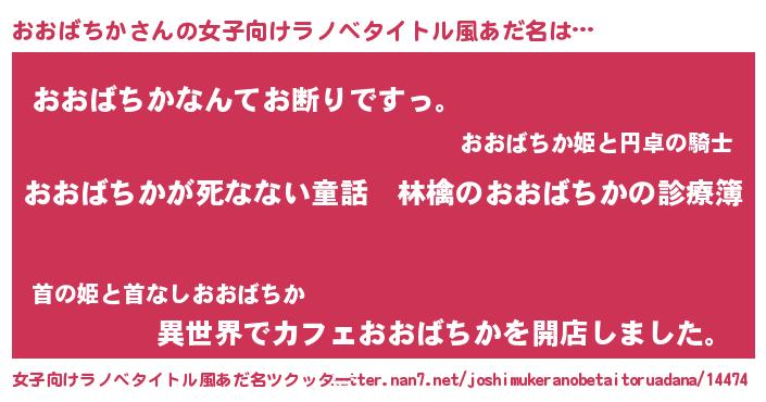 | 男性向けラノベタイトル風あだ名 | 『魔弾の王とおおばちか』 |