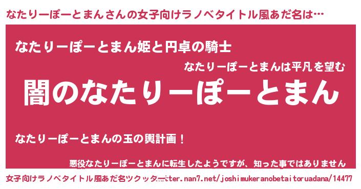 | 男性向けラノベタイトル風あだ名 | 『Re:なたりーぽーとまんから始める異世界生活』 |