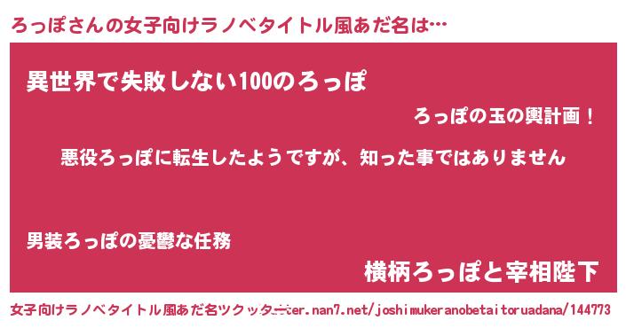 | 男性向けラノベタイトル風あだ名 | 『この素晴らしい世界にろっぽを!』 |