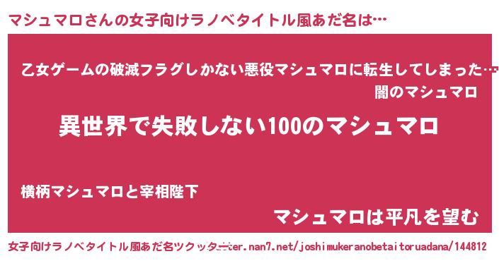 | 男性向けラノベタイトル風あだ名 | 『マシュマロという概念が存在しない退屈な世界 』 |