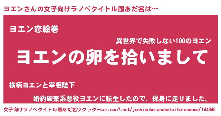 | 男性向けラノベタイトル風あだ名 | 『ダンジョンにヨエンを求めるのは間違っているだろうか』 |