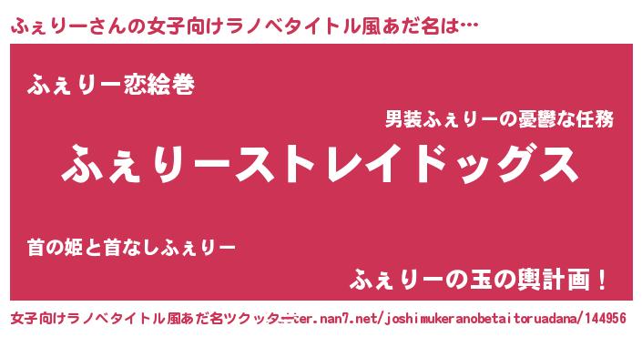 | 男性向けラノベタイトル風あだ名 | 『Re:ふぇりーから始める異世界生活』 |