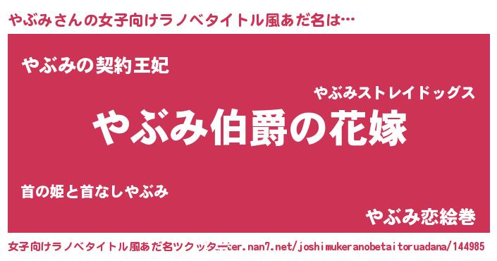 | 男性向けラノベタイトル風あだ名 | 『うちの娘の為ならば、俺はもしかしたらやぶみも倒せるかもしれない。』 |