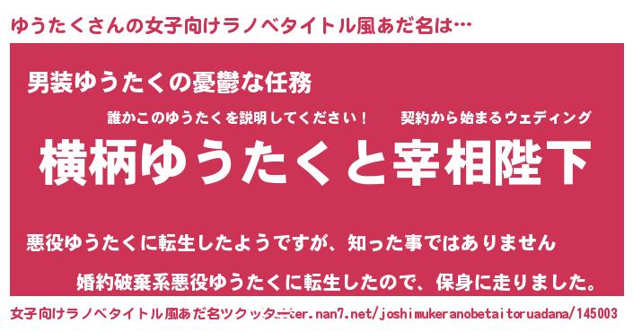 | 男性向けラノベタイトル風あだ名 | 『ゆうたくに滅ぼされるだけの簡単なお仕事です』 |