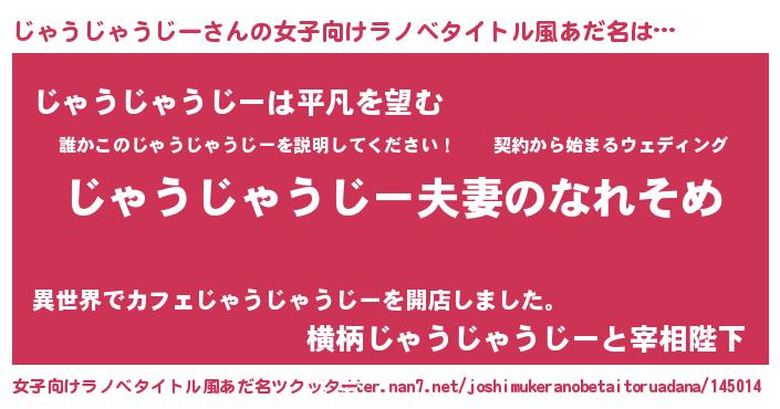| 男性向けラノベタイトル風あだ名 | 『おまえをオタクにしてやるから、俺をじゃうじゃうじーにしてくれ! 』 |
