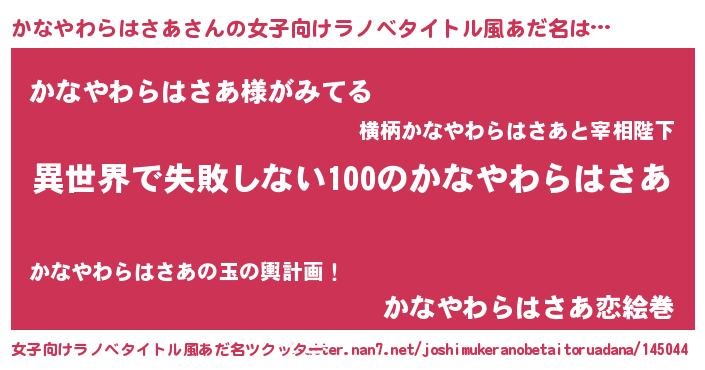 かなやわらはさあさんの女子向けラノベタイトル風あだ名は… 『異世界で失敗しない100のかなやわらはさあ』『かなやわらはさあ様がみてる』『かなやわらはさあ恋絵巻』 ツクッター #女子向けラノベタイトル風あだ名ツクッター http://tkutter.nan7.net/joshimukeranobetaitoruadana/145044/