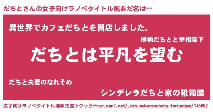 だちとさんの女子向けラノベタイトル風あだ名は… 『だちとは平凡を望む』『異世界でカフェだちとを開店しました。』『シンデレラだちと家の靴箱館』 ツクッター #女子向けラノベタイトル風あだ名ツクッター http://tkutter.nan7.net/joshimukeranobetaitoruadana/145052/