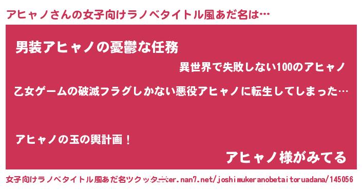 | 男性向けラノベタイトル風あだ名 | 『この素晴らしい世界にアヒャノを!』 |