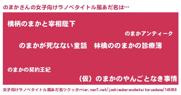 | 男性向けラノベタイトル風あだ名 | 『魔弾の王とのまか』『のまかの憂鬱』 |