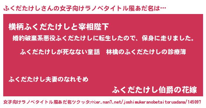 | 男性向けラノベタイトル風あだ名 | 『魔弾の王とふくだたけし』 |