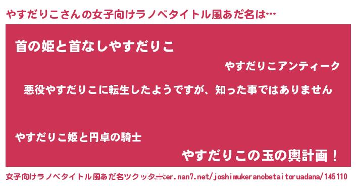 | 男性向けラノベタイトル風あだ名 | 『この素晴らしい世界にやすだりこを!』 |
