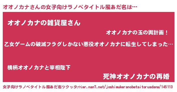 | 男性向けラノベタイトル風あだ名 | 『この素晴らしい世界にオオノカナを!』 |