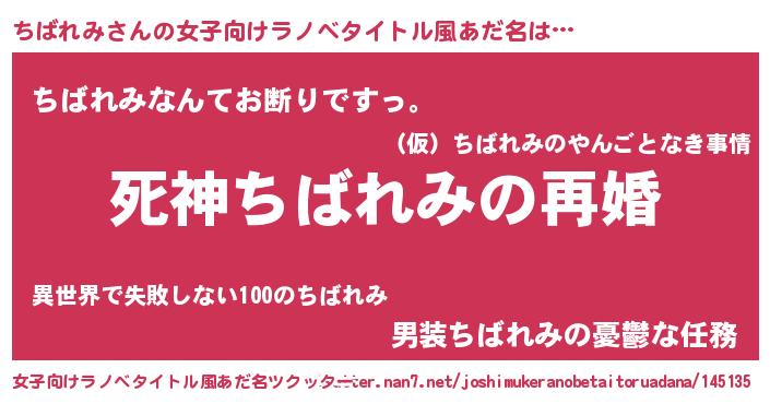 ちばれみさんの女子向けラノベタイトル風あだ名は… 『死神ちばれみの再婚』『ちばれみなんてお断りですっ。』『男装ちばれみの憂鬱な任務』 ツクッター #女子向けラノベタイトル風あだ名ツクッター http://tkutter.nan7.net/joshimukeranobetaitoruadana/145135/