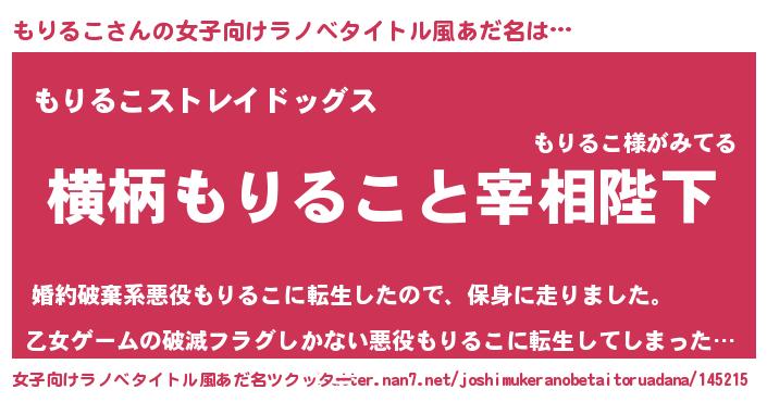 | 男性向けラノベタイトル風あだ名 | 『もりるこに滅ぼされるだけの簡単なお仕事です』 |