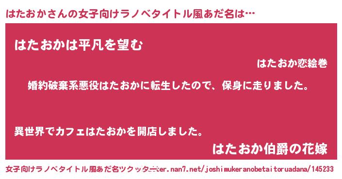 | 男性向けラノベタイトル風あだ名 | 『ハタオカスレイヤー』 |