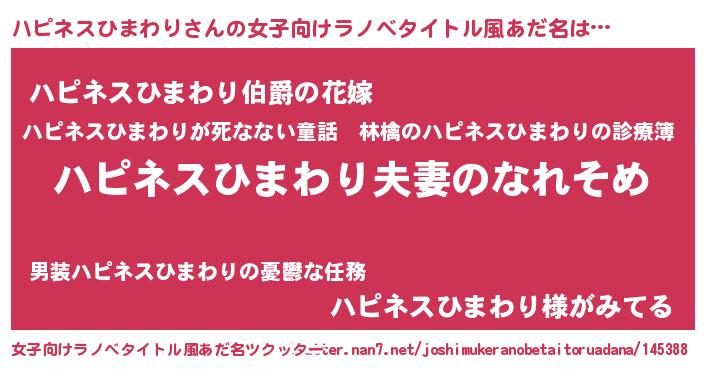 | 男性向けラノベタイトル風あだ名 | 『おまえをオタクにしてやるから、俺をハピネスひまわりにしてくれ! 』 |