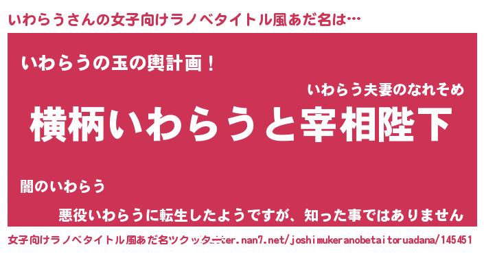いわらうさんの女子向けラノベタイトル風あだ名は… 『横柄いわらうと宰相陛下』『いわらうの玉の輿計画!』『悪役いわらうに転生したようですが、知った事ではありません』 ツクッター #女子向けラノベタイトル風あだ名ツクッター http://tkutter.nan7.net/joshimukeranobetaitoruadana/145451/