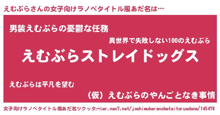| 男性向けラノベタイトル風あだ名 | 『Re:えむぶらから始める異世界生活』 |