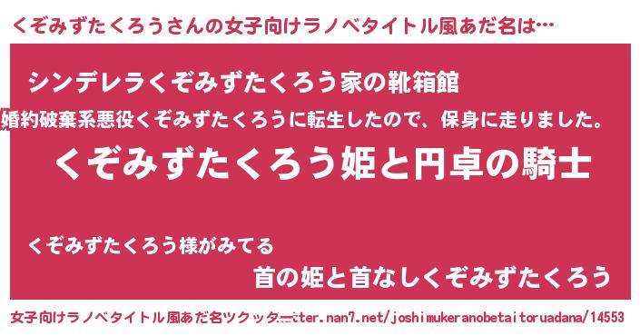 | 男性向けラノベタイトル風あだ名 | 『くぞみずたくろうの憂鬱』 |