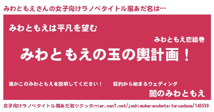 | 男性向けラノベタイトル風あだ名 | 『みわともえ~年齢イコール彼女いない歴の魔法使い~』 |