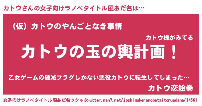 | 男性向けラノベタイトル風あだ名 | 『カトウ~年齢イコール彼女いない歴の魔法使い~』 |
