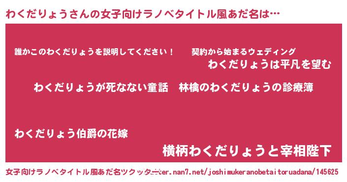 | 男性向けラノベタイトル風あだ名 | 『魔弾の王とわくだりょう』 |